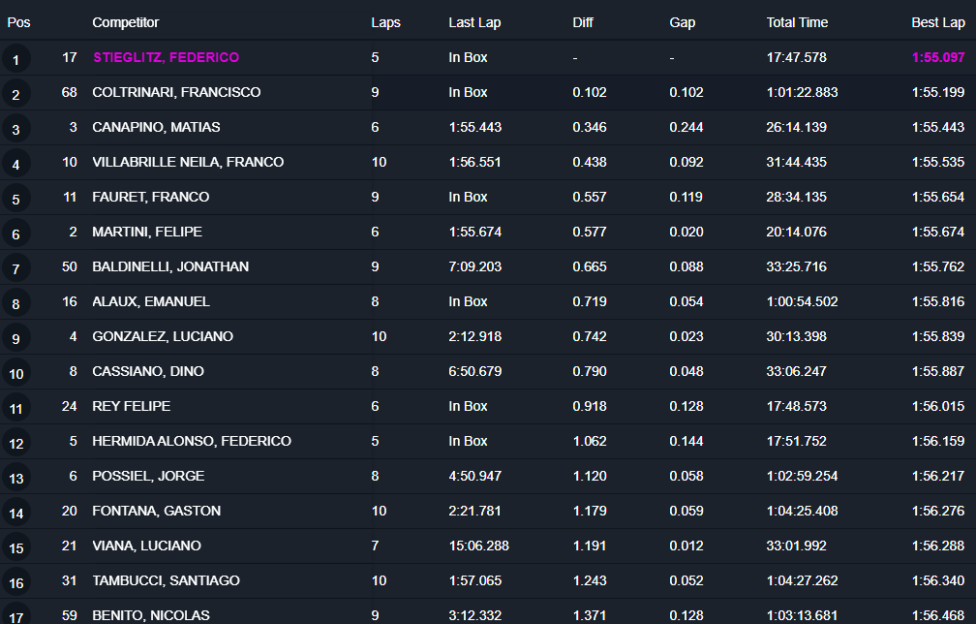 El piloto del Tigre Racing estableció un tiempo de 1m55s097 para su mejor vuelta y bajó en 0s308 el registro que el propio Stieglitz había realizado en la primera práctica en el trazado entrerriano, donde el 14 de abril de 2024 consiguió la primera de sus dos victorias en la Clase 3 del Turismo Pista.