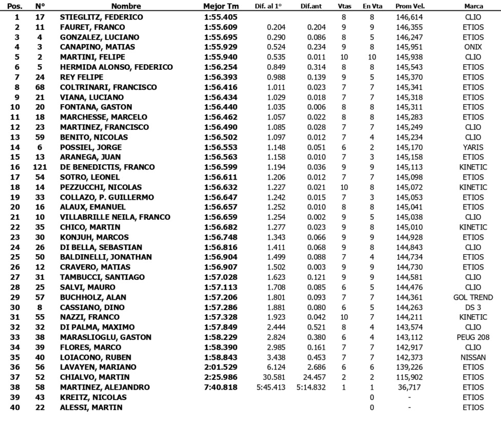 Entre los 10 más veloces de esta primera práctica, sólo 3 no son pilotos de Toyota. Además de Stieglitz, también se destacaron Matías Canapino (Chevrolet Onix) y Felipe Martini (Renault Clio). El arrecifeño del Febase Performance fue 4º a 0s524, mientras que el roqueperense del Tigre Racing se ubicó 5º a 0s535.