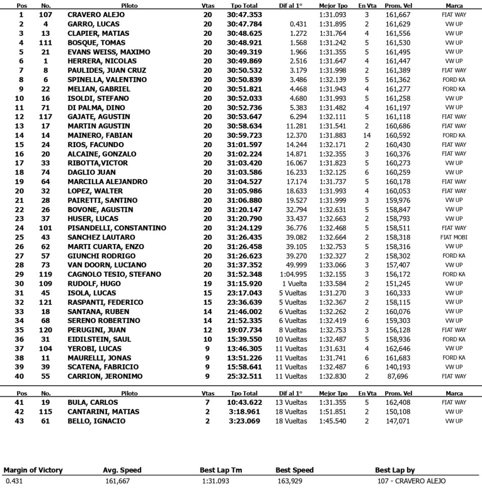 El cordobés largó 10º y en la 11ª vuelta, cuando Matías Clapier (VW Up) doblegó la resistencia del “poleman” Agustín Gajate (Fiat Uno Way), líder desde la largada, aprovechó la succión del trencito de punta para situarse 2º. Allí se mantuvo hasta la última vuelta, cuando ejecutó la precisa maniobra de superación sobre el jujeño en la curva 1.