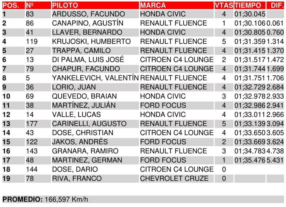 El santafesino bajó en 1s865 el tiempo que había logrado Agustín Canapino (Renault Fluence) en el segundo ensayo de ayer viernes, donde Ardusso justamente había sido 2º a 0s019. En esta ocasión, el representante de Las Parejas superó al arrecifeño por 0s061. Bernardo Llaver (Honda Civic), el tercer candidato al título, se ubicó 3º pero lejos: a 0s760.