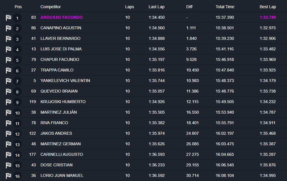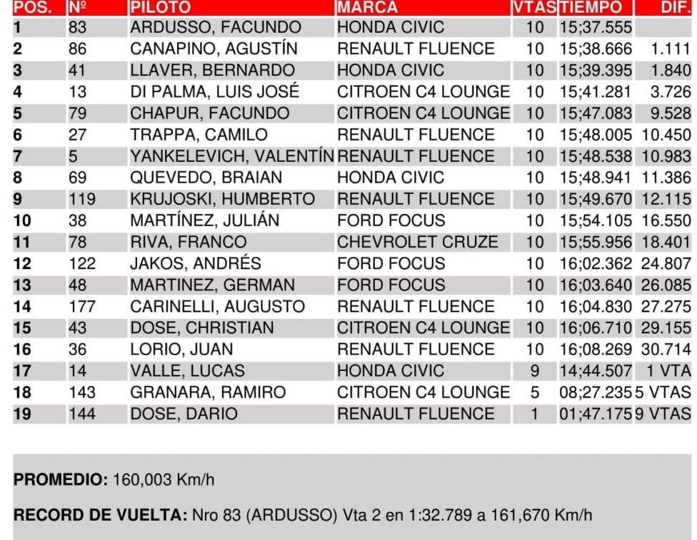 El representante de Las Parejas, que cruzó la meta con una ventaja de 1s111 sobre Canapino, obtuvo su 4ª victoria de la temporada y así igualó la línea del “Titán” como el más ganador del año. “Facu” le descontó 4 puntos al líder del campeonato y ahora la diferencia es de 44 unidades cuando quedan 60 en juego. Una 13ª posición le bastará al arrecifeño para coronarse campeón, sin importar el resultado de Ardusso.