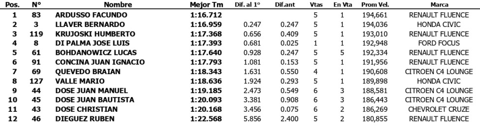 Los Fluence del ACRA Ambrogio Racing fueron mayoría entre los 5 más rápidos, ya que Humberto Krujoski se ubicó 3º a 0s656, mientras que el debutante Lucas Bohdanowicz fue 5º a 0s928. Entre ellos se intercaló “Josito” Di Palma (4º a 0s681) con el Ford Focus del Coiro Competición, modelo que correrá hasta que listo el Toyota Corolla.