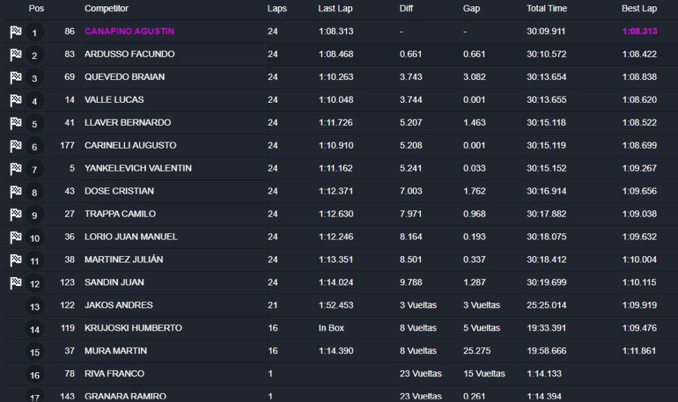 Sin embargo, la aparición del auto de seguridad en la 20ª vuelta le dio a Canapino la posibilidad que seguramente estaba esperando. Ardusso intentó en la reanudación saltar a la punta, pero sobrevino un toque con Llaver a la salida de la curva 1 y el “Titán” aprovechó y fabricó una gran maniobra para adueñarse del liderazgo, que defendió con éxito en los dos giros finales (se terminó por tiempo, 3 vueltas antes de las 27 pactadas).