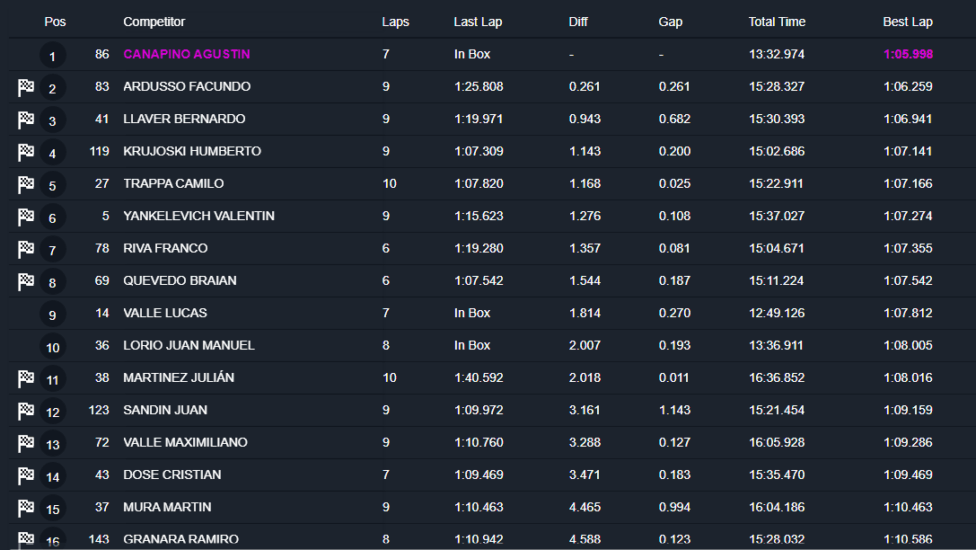 El piloto del Axion Sport Energy marcó un tiempo de 1m05s998 y postergó por 0s261 a Facundo Ardusso (Honda Civic), quien -tal como sucede en el campeonato- escoltó al “Titán”. El arrecifeño bajó en 0s951 el tiempo que él mismo había establecido ayer por la tarde, en el entrenamiento no oficial.