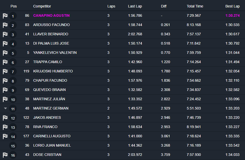 El arrecifeño, que este fin de semana alterna su actividad entre el Turismo Carretera 2000 y la Clase 3 del TN, cronometró un tiempo de 1m30s274 y aventajó por 0s261 a Facundo Ardusso (Honda Civic), quien acumalaba 3 “poles” consecutivas (Paraná, Toay y Río Cuarto) en la categoría. De este modo, el “Titán” igualó al santafesino como el piloto con más “poles” de la temporada (4 cada uno).