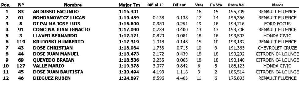 El santafesino, que este año vuelve a representar a Renault de la mano del Ambrogio Racing, logró un tiempo de 1m16s301 con el mismo Fluence que Agustín Canapino llevó al título la temporada pasada. El representante de Las Parejas bajó en 1s328 el tiempo que había establecido ayer.