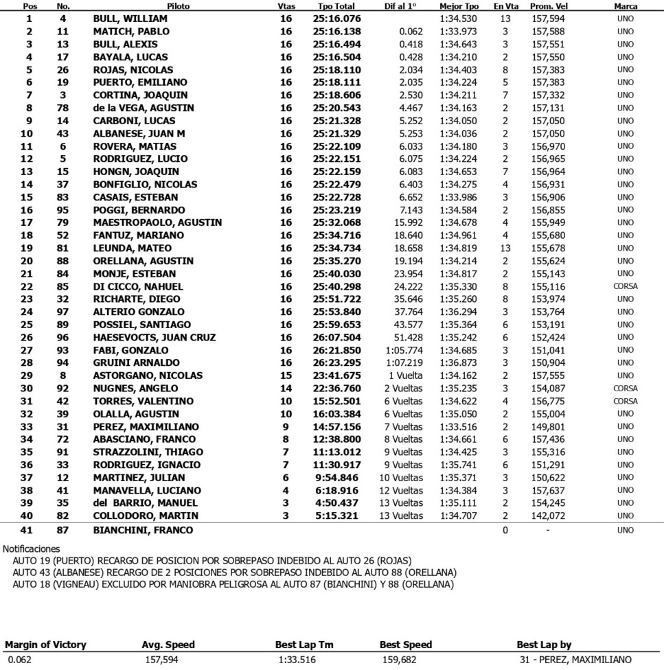En 2025, y al cabo de una carrera espectacular, William Bull (Fiat Uno) largó 4º y logró su 1ª victoria en la Clase 1 del Turismo Pista en el autódromo de Toay. Este año, la división menor del TP entregó otra Final extraordinaria y nuevamente la victoria fue para el santacruceño, que partió 5º en esta 2ª fecha del campeonato 2026. Al igual que en octubre pasado, el piloto del Fagnani Racing concretó el sobrepaso que le dio el triunfo en la última vuelta.
