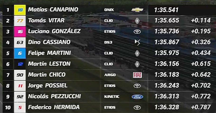 El piloto del Febase Performance, que este año ya había obtenido el “1” en Concordia y Toay, se hizo acreedor a los dos primeros puntos en juego del fin de semana gracias al registro de 1m35s541 del viernes. De esta manera, el líder del campeonato amplió a 7 unidades la ventaja sobre Felipe Martini (Renault Clio), su escolta, que clasificó 5º.