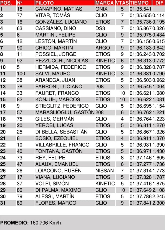 Dino Cassiano (DS3) produjo el avance más destacado respecto de la clasificación del viernes, ya que pasó de la 13ª a la 4ª posición (a 0s326), lo que relegó un lugar en el ordenamiento a Felipe Martini (Renault Clio), que quedó 5º a 0s424. Jorge Possiel (Toyota Etios) y Federico Hermida (Toyota Etios), los otros candidatos al título, clasificaron 8º (a 0s702) y 10º (a 0s787), respectivamente.