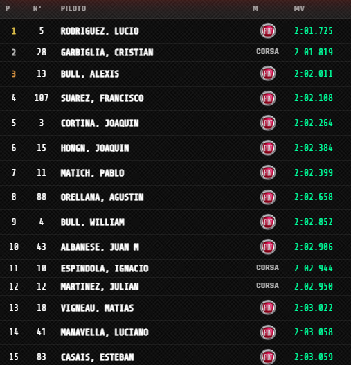 El piloto del Edi-Car Racing, que ayer había clasificado 7º a 0s709, desplazó de la cima a Alexis Bull (Fiat Uno), que había sido el más veloz de la primera tanda clasificatoria. Con la asistencia de Carlos Piaggentini y los motores de Francisco Traiana en su Fiat Uno, Rodríguez marcó un tiempo de 2m01s725 y bajó en 0s906 el registro del santacruceño.